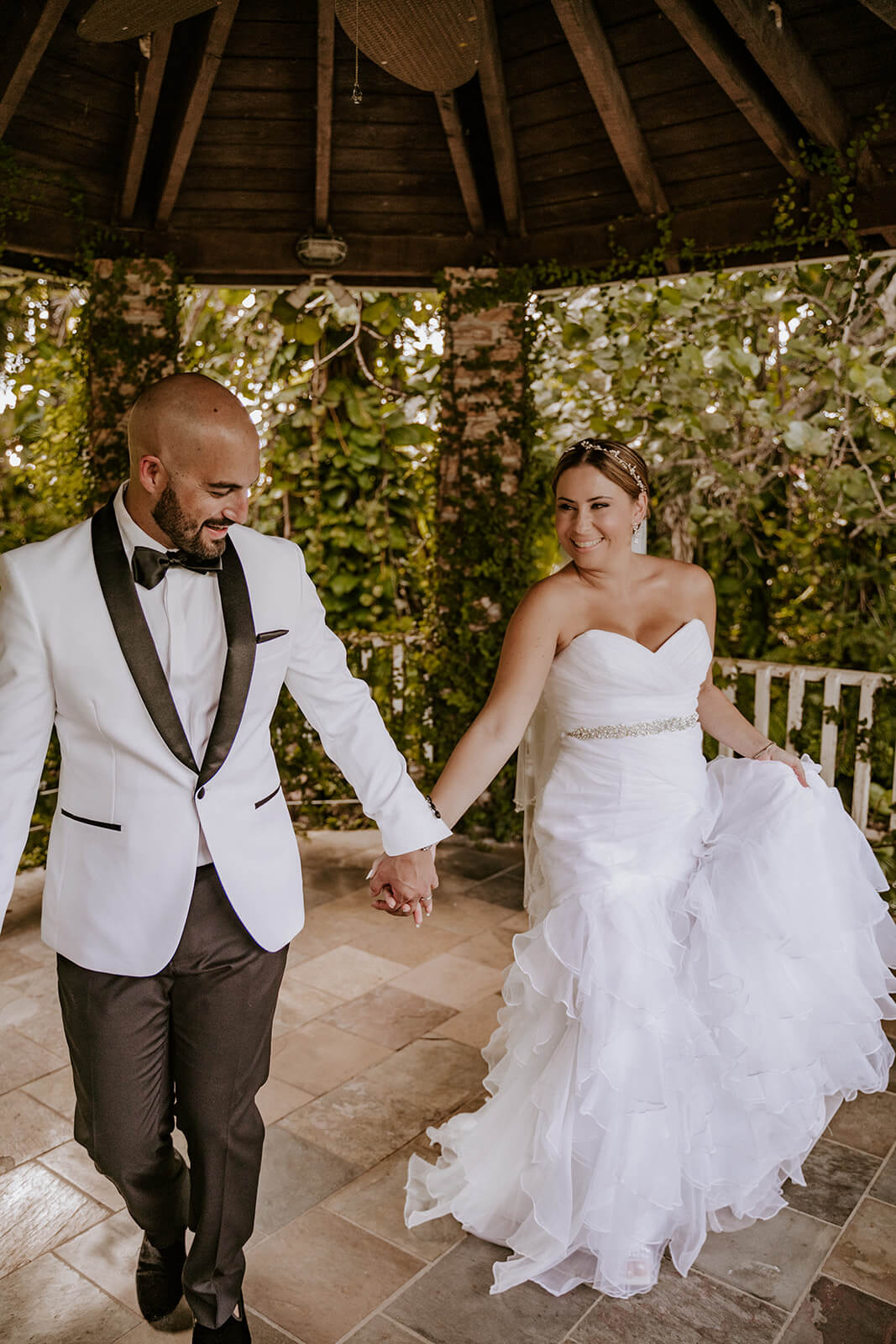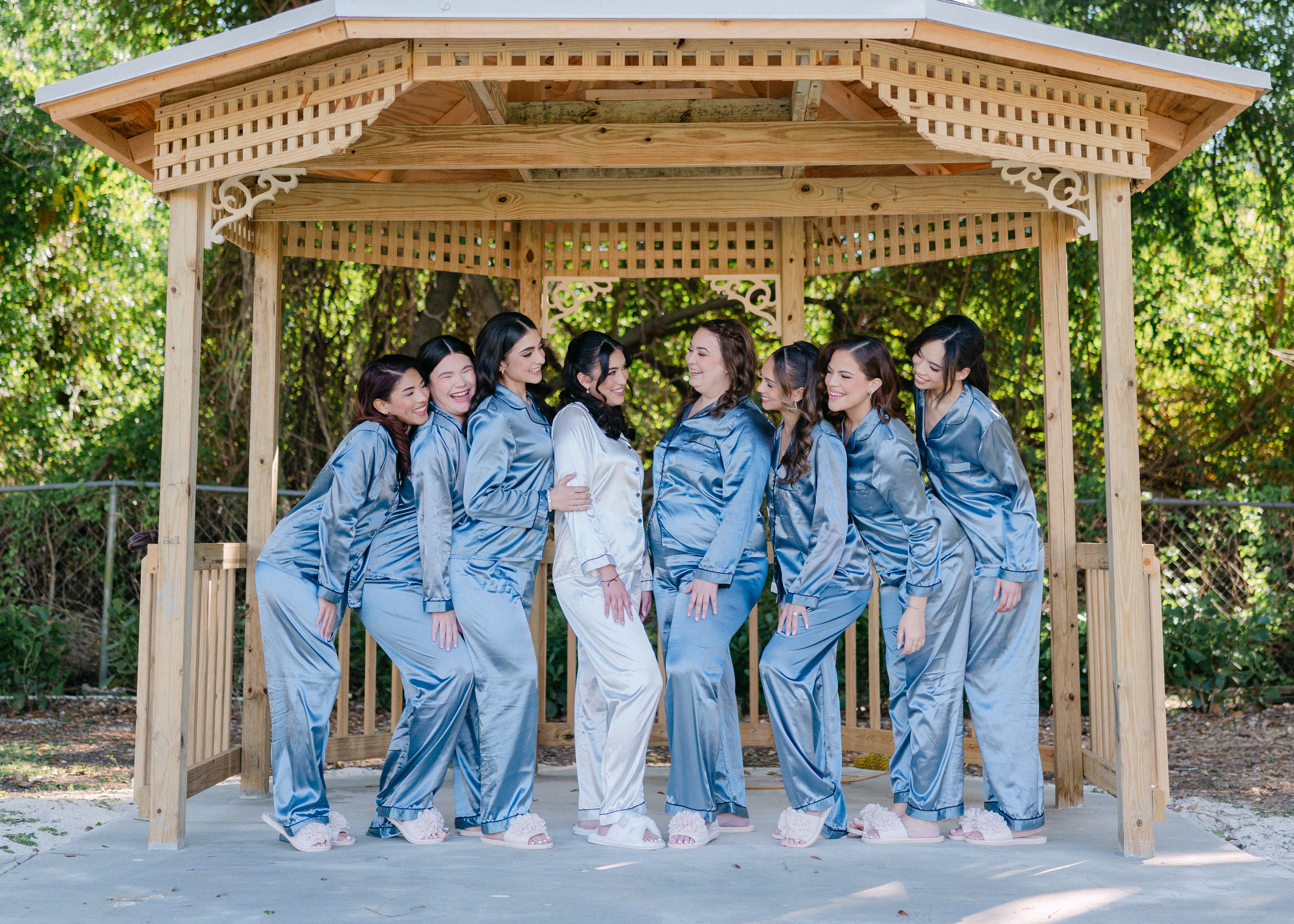 An elegant, wooden gazebo structure providing a charming focal point for first looks & photos