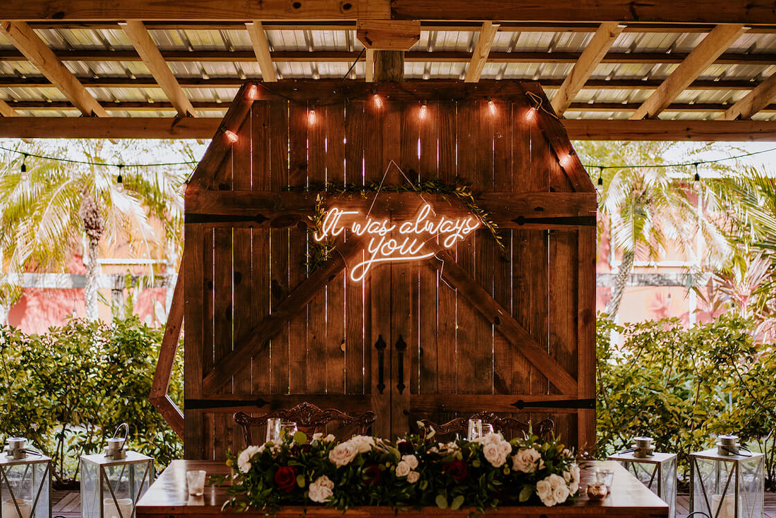 A charming sweetheart table area with a wooden backdrop perfect for custom neon signs & decor
