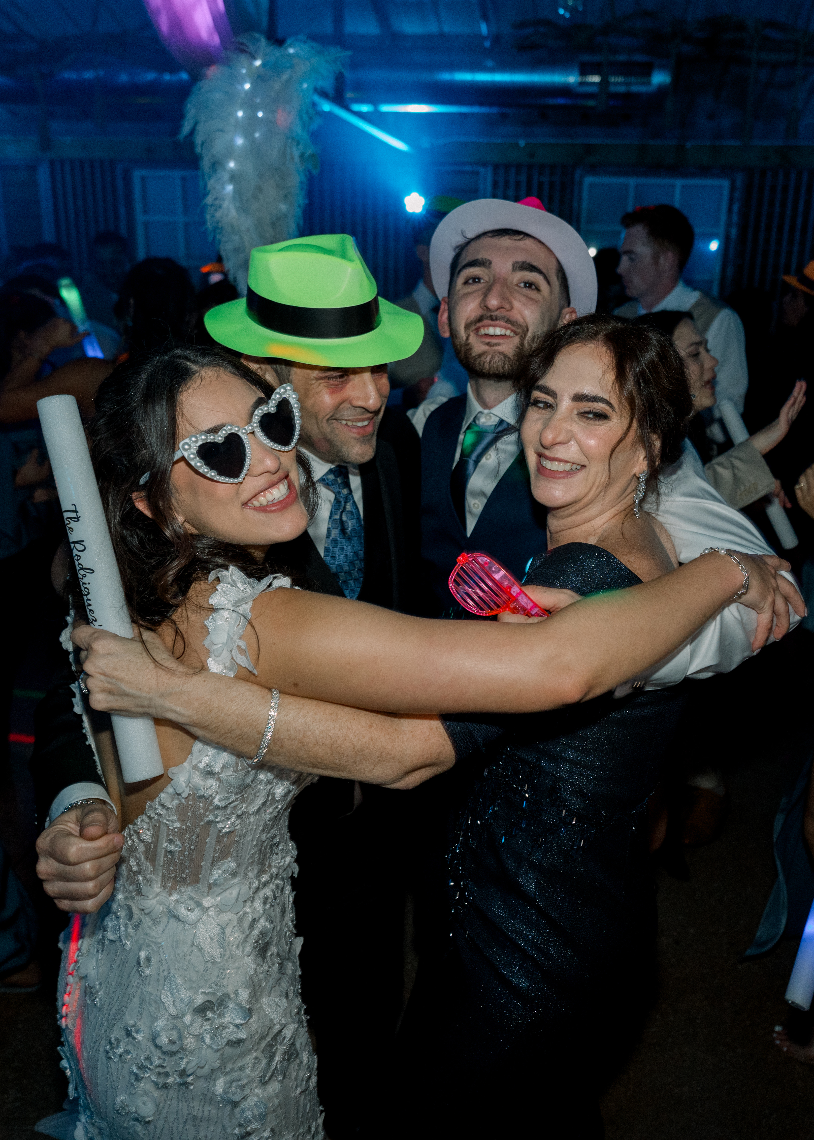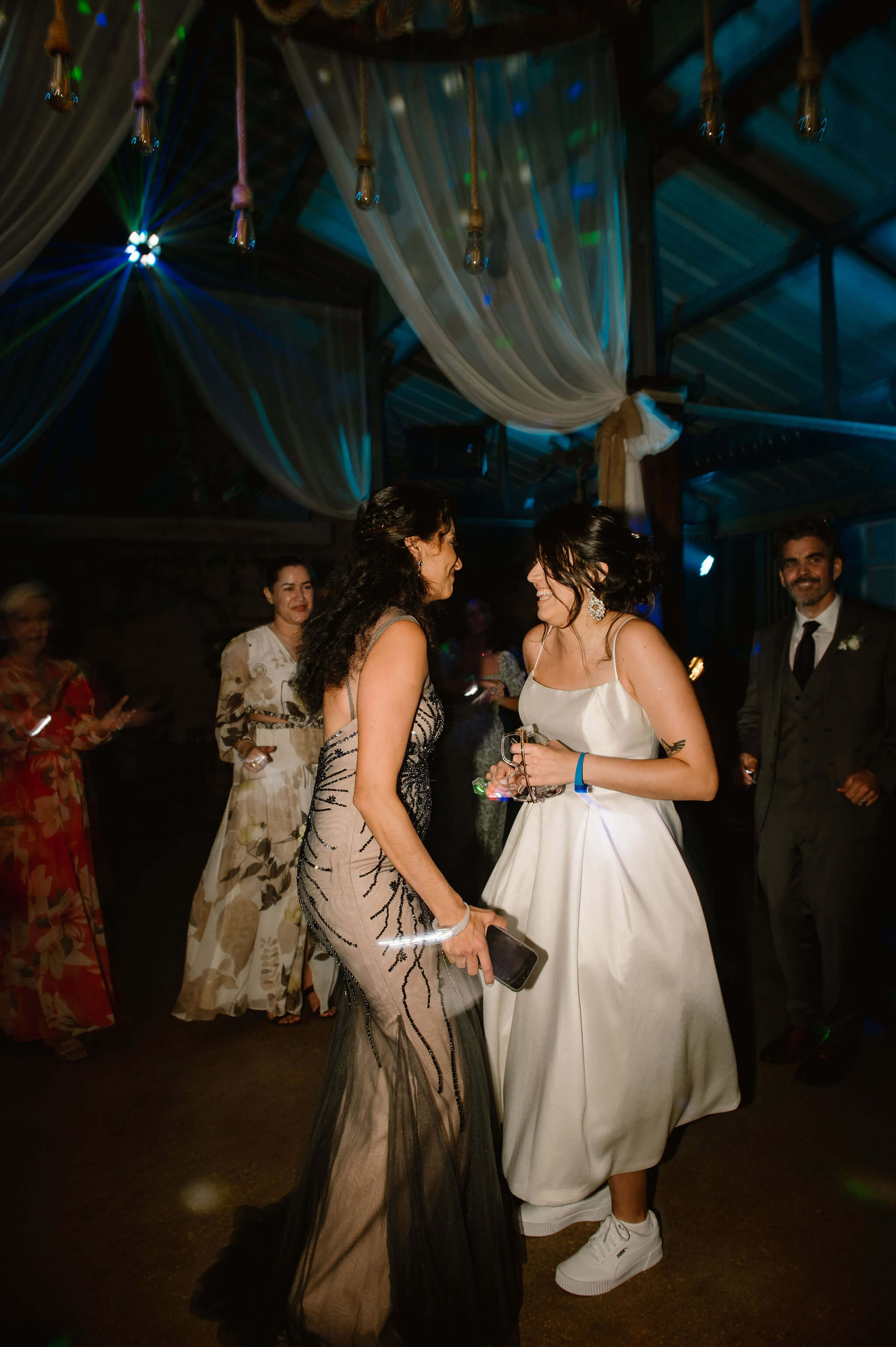 A spacious dance floor area for guests to enjoy, highlighted by patterned lighting effects