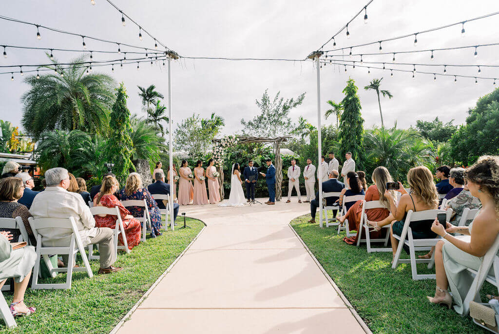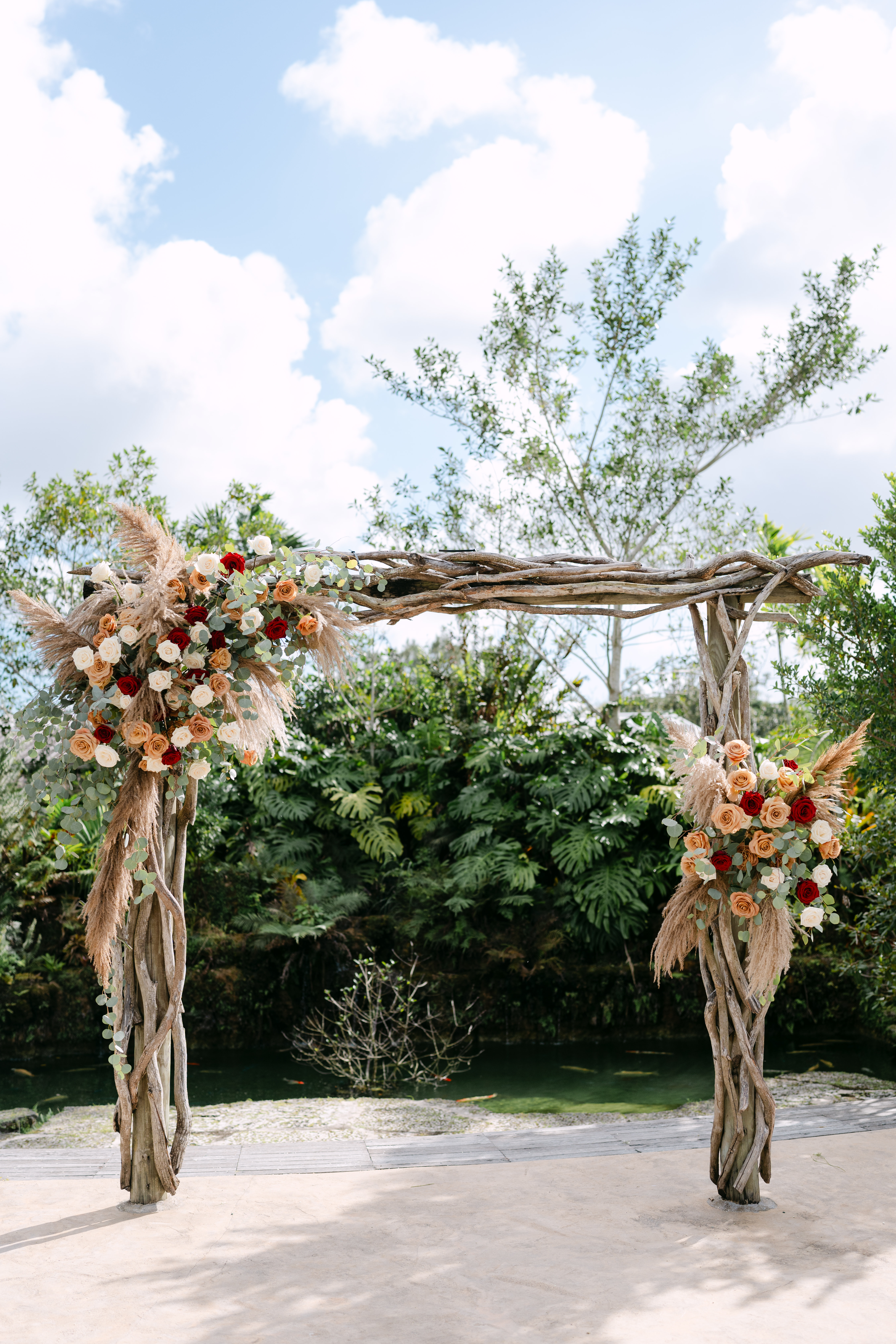 One of a kind ceremony backdrop with a Koi pond featuring waterfalls and lush tropical plants