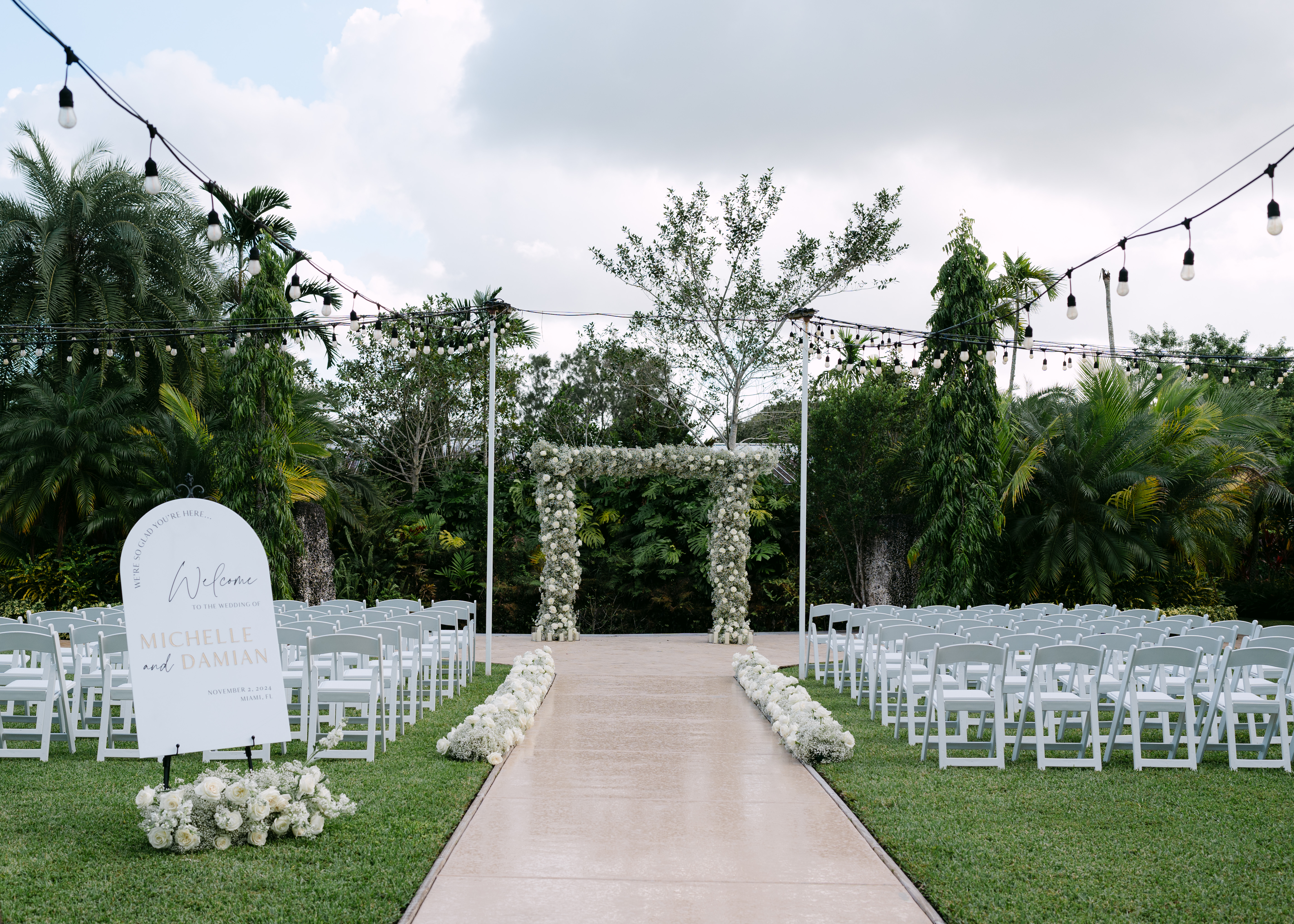 A neatly arranged seating area with white chairs on a well-manicured lawn, providing a classic and elegant setting for guests